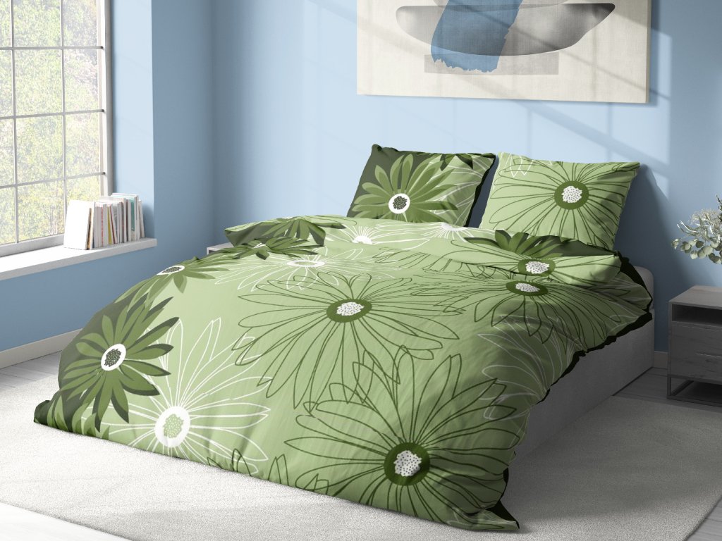 Kvalitní bavlněné povlečení na jednolůžko s lehkým rostlinným motivem velkých zelených květů, které na světle zeleném podkladu navozuje pocit svěžího ranního probuzení. Povlečení je vyrobeno ze 100% bavlny. Je velmi příjemné na dotek, poskytuje maximální pohodlí a výborně absorbuje vlhkost, což oceníte především v letních měsících. Vysoká kvalita zpracování zajišťuje stálost barev a rozměrů. Toto povlečení s unikátním designem květů standardní velikosti na jednolůžko obsahuje 1x povlak na polštář o velikosti 70x90 cm a 1x povlak na velkou postel o velikosti 140x200 cm. Klasické zapínání povlečení na knoflíky.
