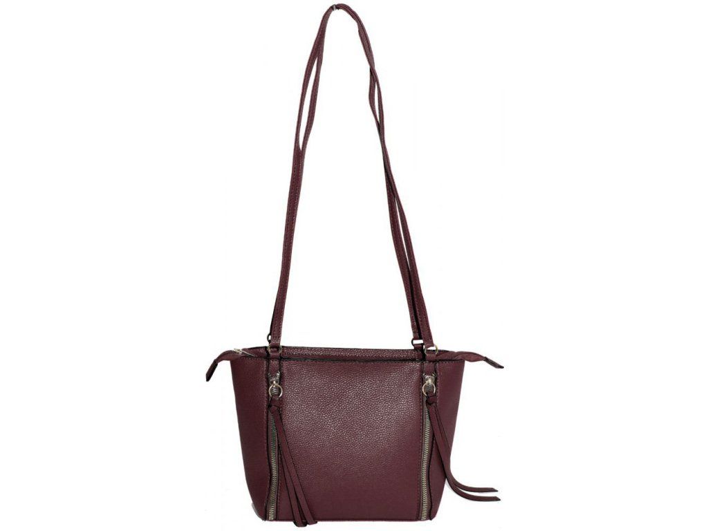 Dámská kabelka je vyrobena z vysoce kvalitní a pevné eko kůže. Vnitřní část tvoří podšívka z polyesterové vlny. Tato stylová vínová kabelka je praktická a prostorná. Vejde se do ní to nejdůležitější (mobilní telefon, peněženka, klíče) plus nějaké ty drobnosti. Má jeden hlavní úložný prostor se zapínáním na zip. Je vybavena jednou vnitřní kapsou se zipem. Na přední straně zdobí kabelku dva zipy s třásněmi. Nosí se pohodlně díky dlouhým rukojetím, které umožňují nošení v ruce i přes rameno. Zdobí ji zlaté kování, které dodává kabelce osobitý vzhled. Tuto kabelku si zamilujete a stane se Vaším každodenním společníkem ve dnech, kdy postačí mít sebou pouze ty nejdůležitější věci. Je vhodná na cesty do práce nebo do společnosti. Rozměry tašky jsou 21 x 30 x 10 cm.