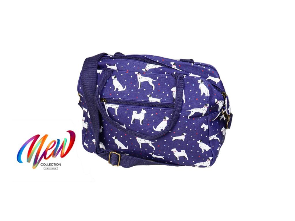Dámská taška do ruky i přes rameno je vyrobena z vysoce kvalitního a voděodolného materiálu. Vnitřní část tašky tvoří podšívka z polyesterové vlny. Tato tmavě modrá taška s motivem psů (dog) má jeden hlavní úložný prostor uzavíratelný na zip. Je vybavená dvěma vnitřními kapsičkami na mobil a drobnosti. Tašku zdobí dvě vnější prostorné kapsy uzavřené magnetem a jedna praktická kapsa se zipem, do které si můžete uložit věci, které chcete mít po ruce. Je praktická, vejde se do ní to nejdůležitější (mobilní telefon, peněženka, klíče). Nosí se pohodlně díky nastavitelnému popruhu. Má dvě rukojeti, takže ji lze nosit v ruce. Bude vašim dobrým společníkem při cestě do města nebo na výlet. Vhodná pro cestování, jízdní kolo, trekking nebo turistiku. Rozměry tašky jsou 29x23x11 cm.Doplňkové parametry