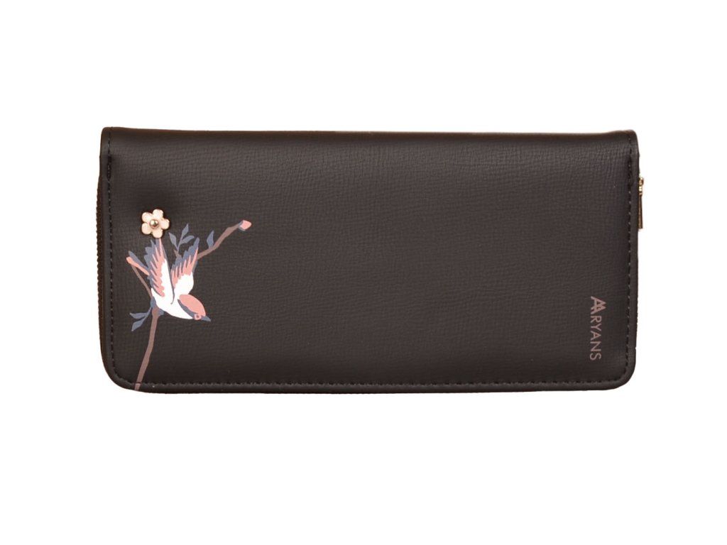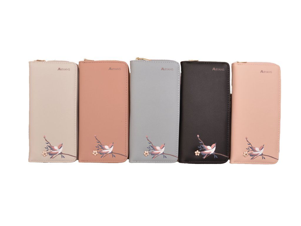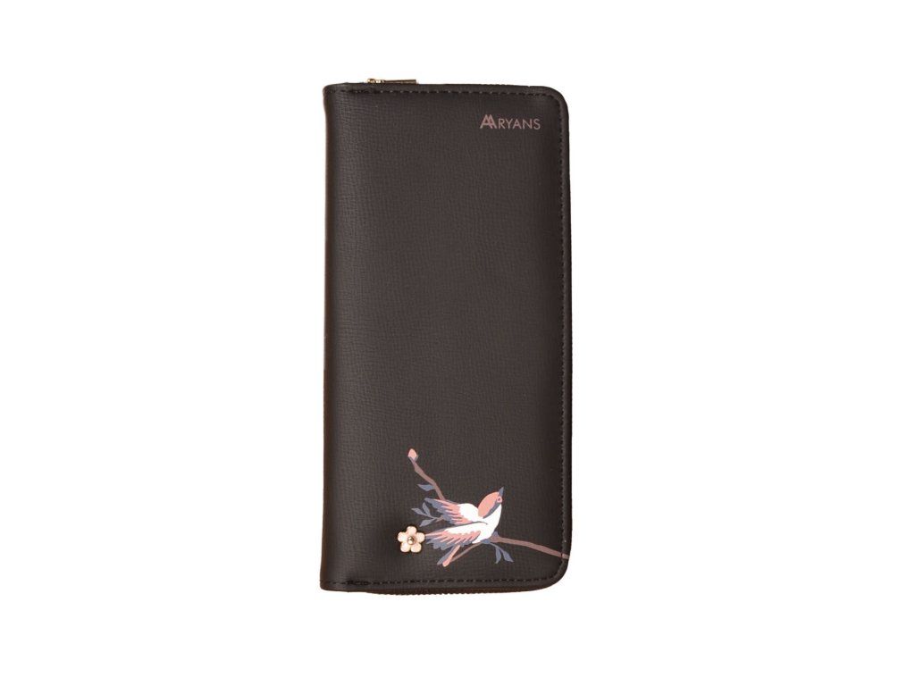 Elegantní peněženka z ekologické kůže, je příjemná na dotek. Peněženka má 2 oddíly - na zip a klopu na cvok na karty. Peněženku zdobí potisk jemné kresby ptáčka a kovová kytička s emailem. Logo AAryans je malým písmem na klopové straně a uvnitř ještě vyraženo. Peněženka má výrazný,ale zároveň proti jiným modelům poměrně jemný zlatý zip. Členění je jednoduché.