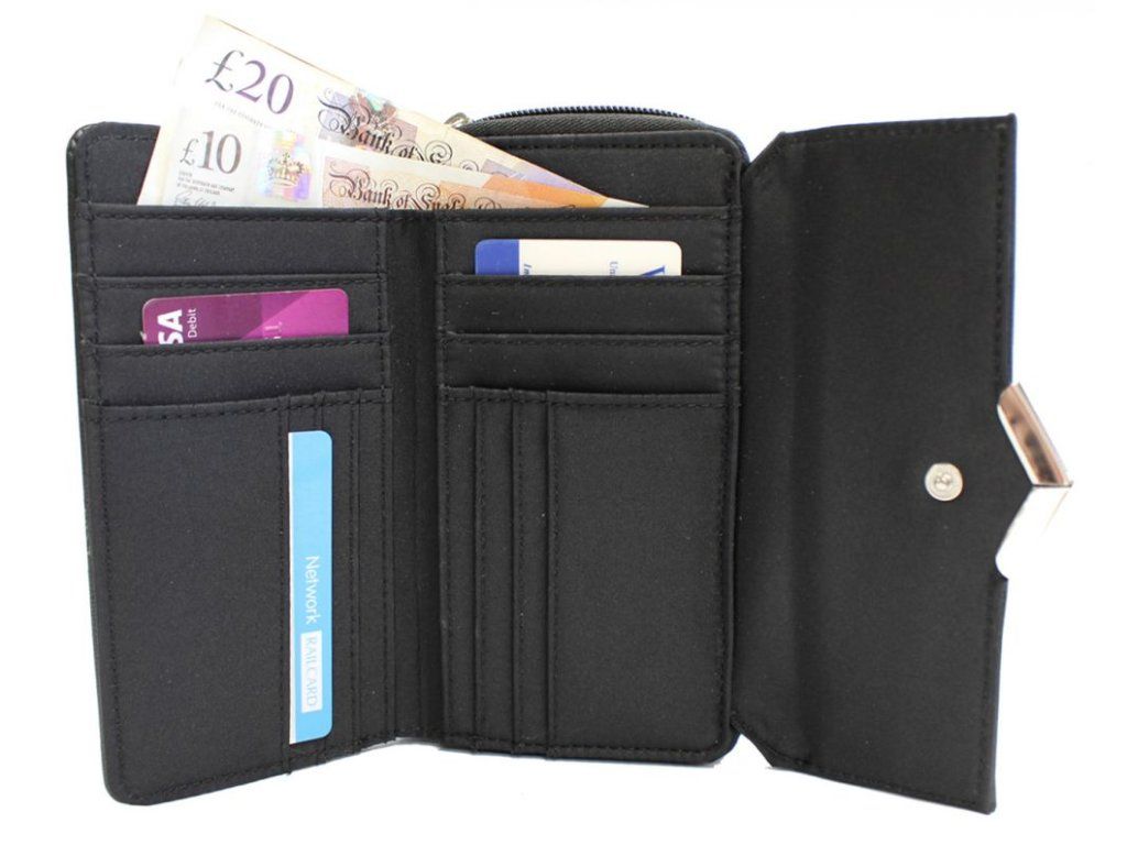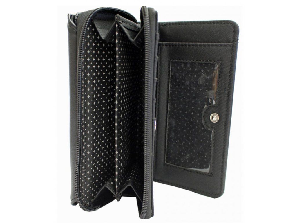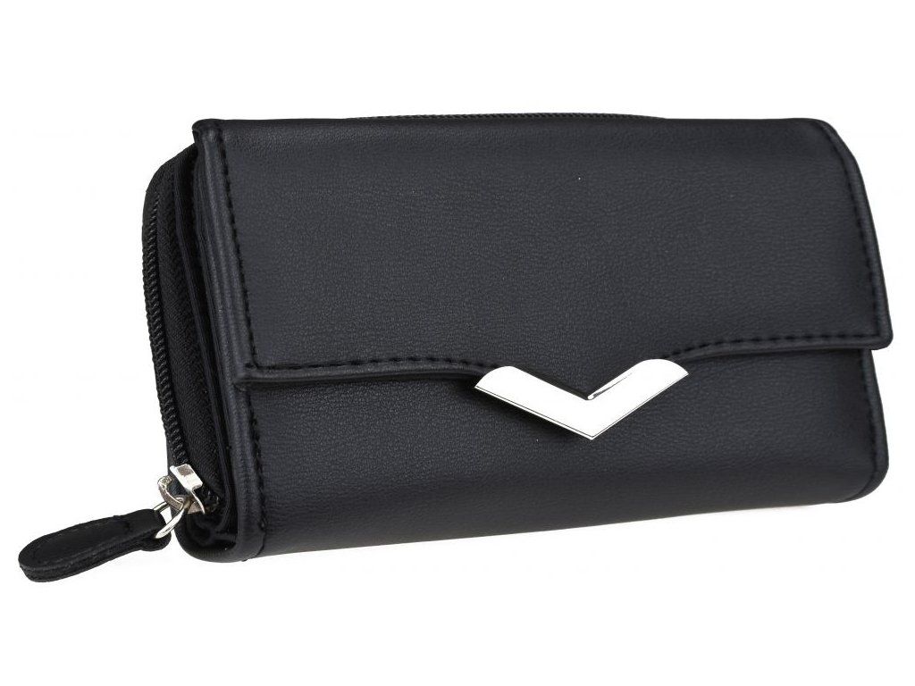 Elegantní a módní dámská peněženka černé barvy pro každou stylovou ženu je vyrobena z kvalitní eko kůže. Svými rozměry 10 x 17 x 4 cm se vejde do každé kabelky či batůžku. Peněženka obsahuje velkou přihrádku na bankovky, kapsu se zipem sedmnáct kapes na kreditní karty, čtyři menší kapsy. Dále obsahuje jednu vnější kapsu a průhlednou kapsu na fotku. Kabelka má praktické zapínání na cvoček.
