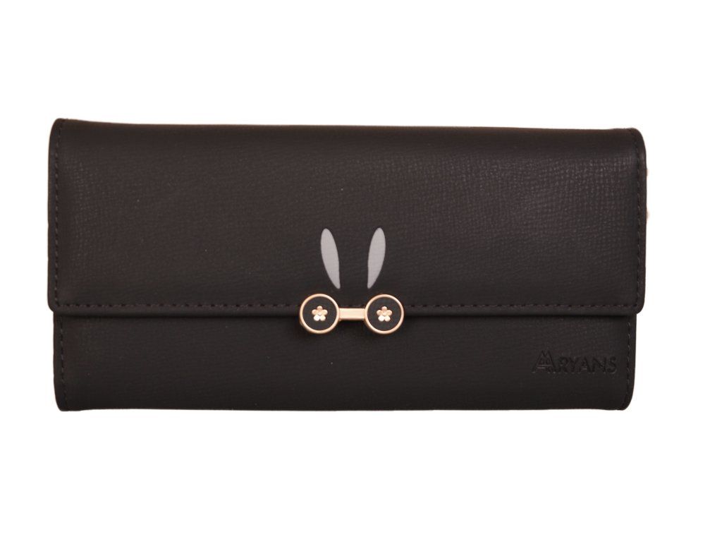 Krásná peněženka s něžnou aplikací v zavírání; 2 kytičky ve spojených kroužcích, doplněné dvěma raženými a dobarvenými lístky v povrchu peněženky. Zhruba uprostřed pod aplikací je patent na zavírání. Vpravo dole je nenápadný ražený emblém AAryans.