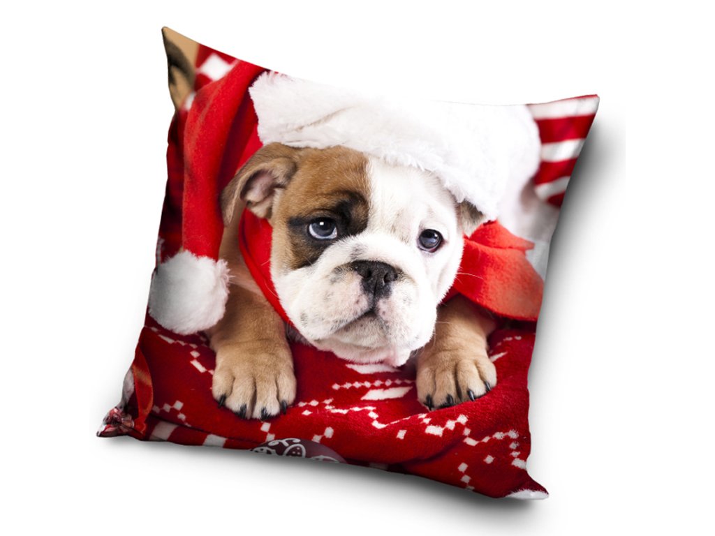 Vánoční polštářek Buldok s červenou čepičkou 40x40 cm
