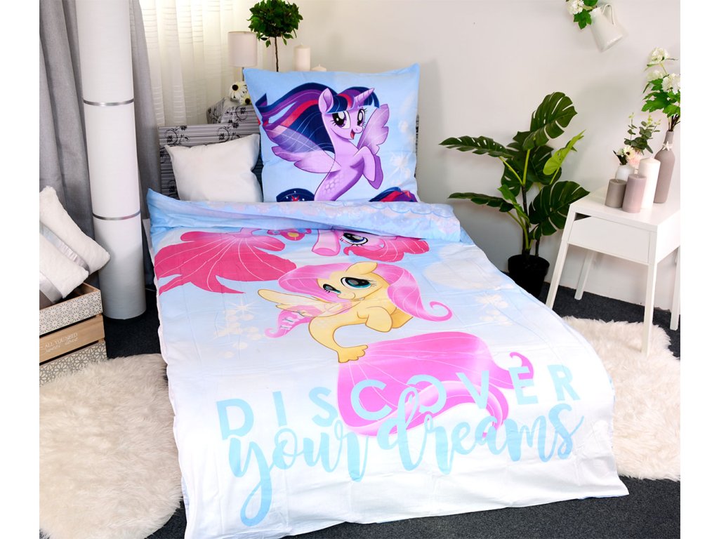 Kvalitní dětské povlečení Herding My Little Pony je vyrobeno z 100% bavlny. Je velmi příjemné na dotek, spolehlivě zahřeje a zároveň výborně absorbuje vlhkost. Toto krásné světle modré povlečení s motivem barevných létajících poníků potěší především holky. Jelikož je povlečení oboustranné, jen tak vás neomrzí a váš pokoj získá osobitý styl. Stačí jen otočit a z jednoho povlečení máte rázem dvě. Jistě oceníte i praktické zapínání na zip, který vám ušetří čas při pravidelném převlékání. Balení obsahuje polštář 80 x 80 cm a přikrývku 135 x 200 cm.