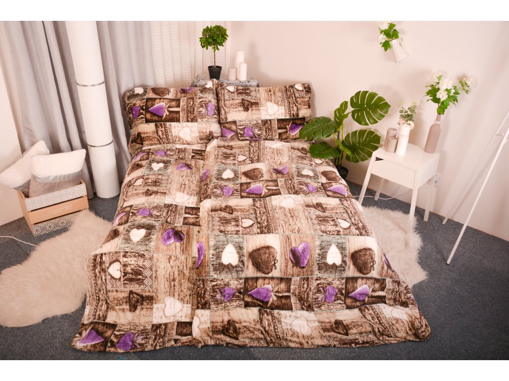 Francouzské povlečení Petra ve fialové barevné variantě je zdobené výrazným motivem srdíček, který je na fotografii plošně rozložený a dobře čitelný. Vzor působí dekorativně a hravě, zároveň však zachovává vizuální řád, díky čemuž nepůsobí rušivě. Fialový podklad dodává povlečení jemně výrazný a osobitý charakter, který ložnici zútulní a vizuálně oživí.