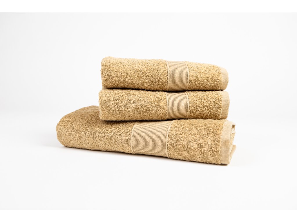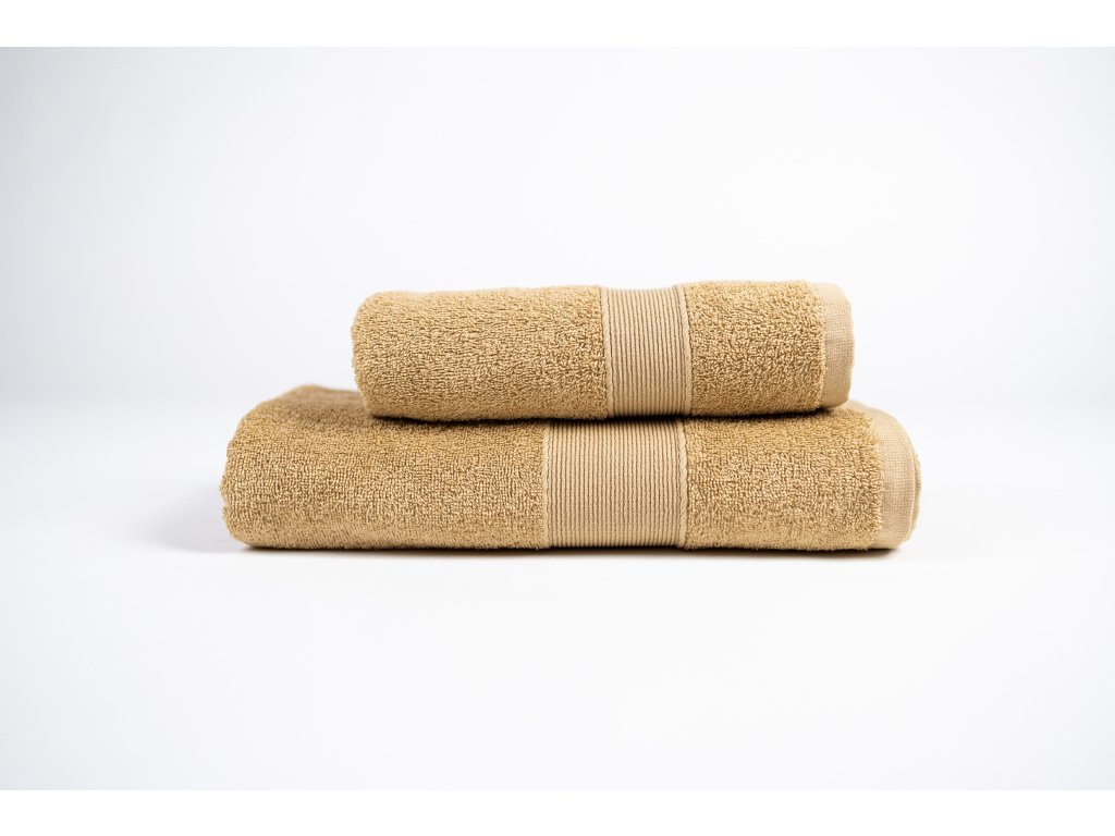 Vysoká gramáž garantuje dlouhou životnost, pevnost a tvarovou stálost i při pravidelném praní. Běžová osuška je esteticky zvýrazněna širokým ozdobným pruhem uprostřed, tvořeným svislým jemným žebrováním, které dodává elegantní a čistý vzhled.