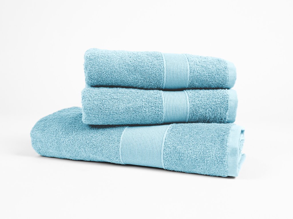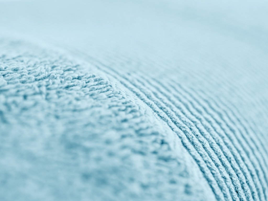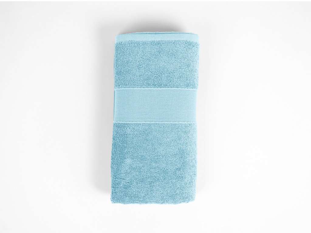 Vysoká gramáž garantuje dlouhou životnost, pevnost a tvarovou stálost i při pravidelném praní. Světle modrá osuška je esteticky zvýrazněna širokým ozdobným pruhem uprostřed, tvořeným svislým jemným žebrováním, které dodává elegantní a čistý vzhled.