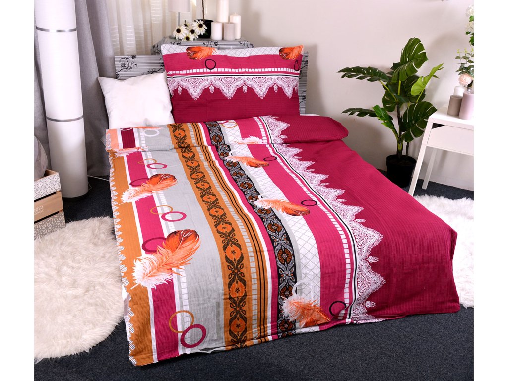 Kvalitní krepové povlečení na jednolůžko s bohatým tradičním vzorem, kombinujícím jasně oranžové akcenty, okrové tóny a bílé detaily na tmavě vínovém podkladu. Krepové povlečení je vyrobeno z 80 % bavlny a 20 % polyesteru. Je příjemné na dotek a rovněž vyniká svou kvalitou, která zaručuje stálost barev i rozměru. Jistě oceníte i jeho velmi snadnou údržbu. Nemačká se a není ho tedy třeba žehlit. Poskytuje skvělou termoizolaci, díky čemuž vás v zimě zahřeje a v létě naopak poskytne příjemný chladivý efekt. Jeho prodyšnost zároveň zabraňuje nadměrnému pocení. Standardní velikost povlečení na jednolůžko obsahuje 1x povlak na polštář o velikosti 70x90 cm a 1x povlak na velkou postel o velikosti 140x200 cm. Klasické zapínání povlečení na knoflíky.