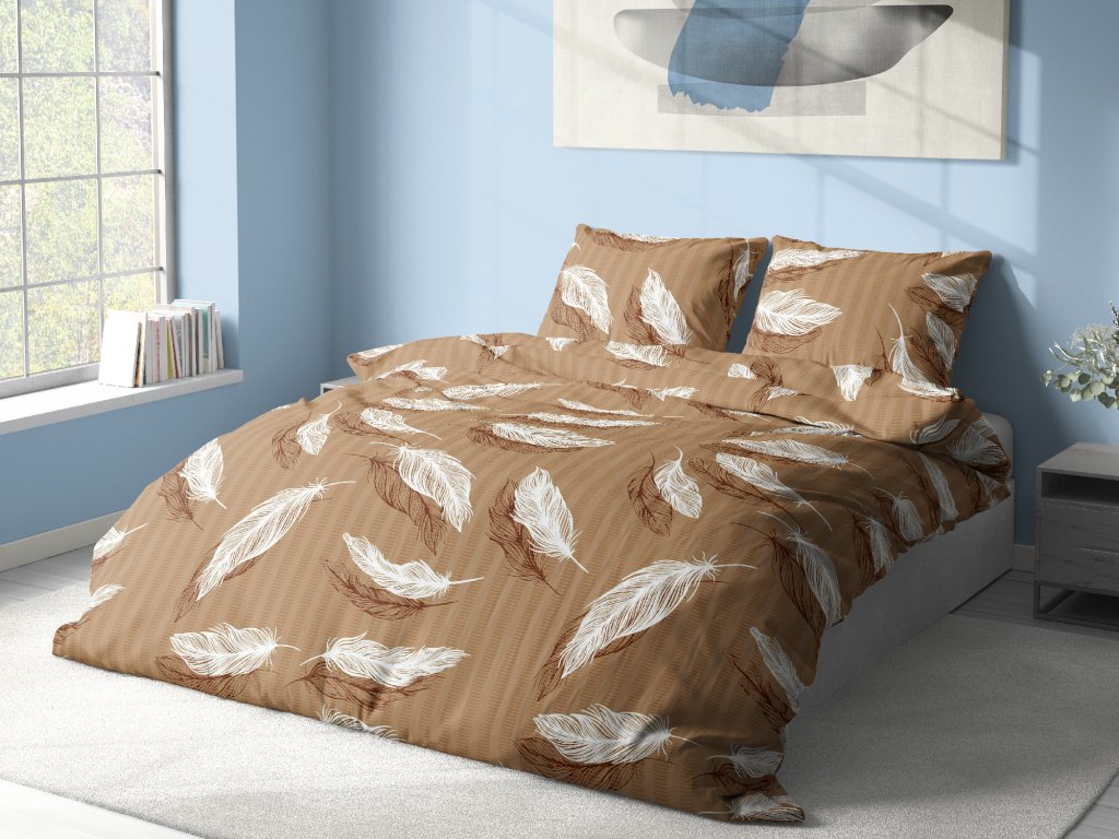 Hnědé barevné ladění se velmi dobře kombinuje s dalšími textiliemi v ložnici. Povlečení doporučujeme doplnit o jednobarevná prostěradla a měkké deky ve světlých, krémových nebo přírodních odstínech, které podpoří klidný a harmonický vzhled celé postele.