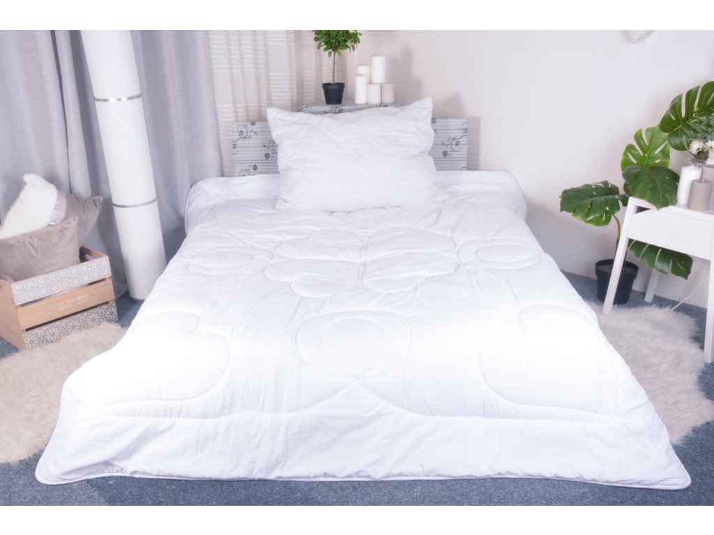 Set Comfort Srdce nabízí kompletní ložní řešení pro pohodlný spánek během celého roku. Obsahuje prošívanou přikrývku 140×200 cm a polštář 70×90 cm, vyrobené z jemného mikrovlákna (580 g/m²) a vyplněné dutým polyesterovým vláknem. Díky pevnějšímu prošití výplň neklesá ani se neposouvá.