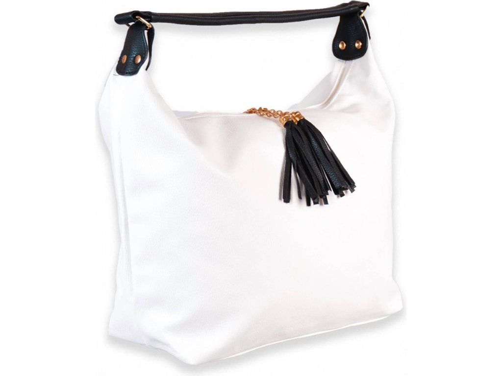 Dámská kabelka je vyrobena z vysoce kvalitní eko kůže. Vnitřní část tvoří podšívka z polyesterové vlny. Tato stylová bílá kabelka s bílými doplňky je praktická a vejde se do ní to nejdůležitější (mobilní telefon, peněženka, klíče) plus nějaké ty drobnosti. Má jeden hlavní úložný prostor se zapínáním na zip. Je vybavena třemi vnitřními kapsami, z nichž jedna je na zip a jednou vnější kapsou uzavřenou zipem, do které si můžete uložit věci, které chcete mít po ruce. Zdobí ji třásně a zlaté kování, které dodá kabelce osobitý vzhled. Nosí se pohodlně díky praktické rukojeti. Tuto tašku si zamilujete a stane se Vaším každodenním společníkem ve dnech, kdy postačí mít sebou pouze ty nejdůležitější věci. Rozměry tašky jsou 26x40x12 cm.
