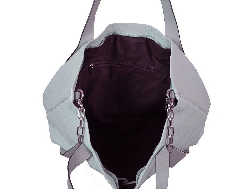 Jednoduchá kabelka přes rameno z kvalitní ekologické kůže a se stříbrným kováním. Zavírá se na zip. Má tři vnitřní kapsy na mobil, klíče či jiné drobnosti. Kabelka je zdobená řetízkem, který lze odepnout.