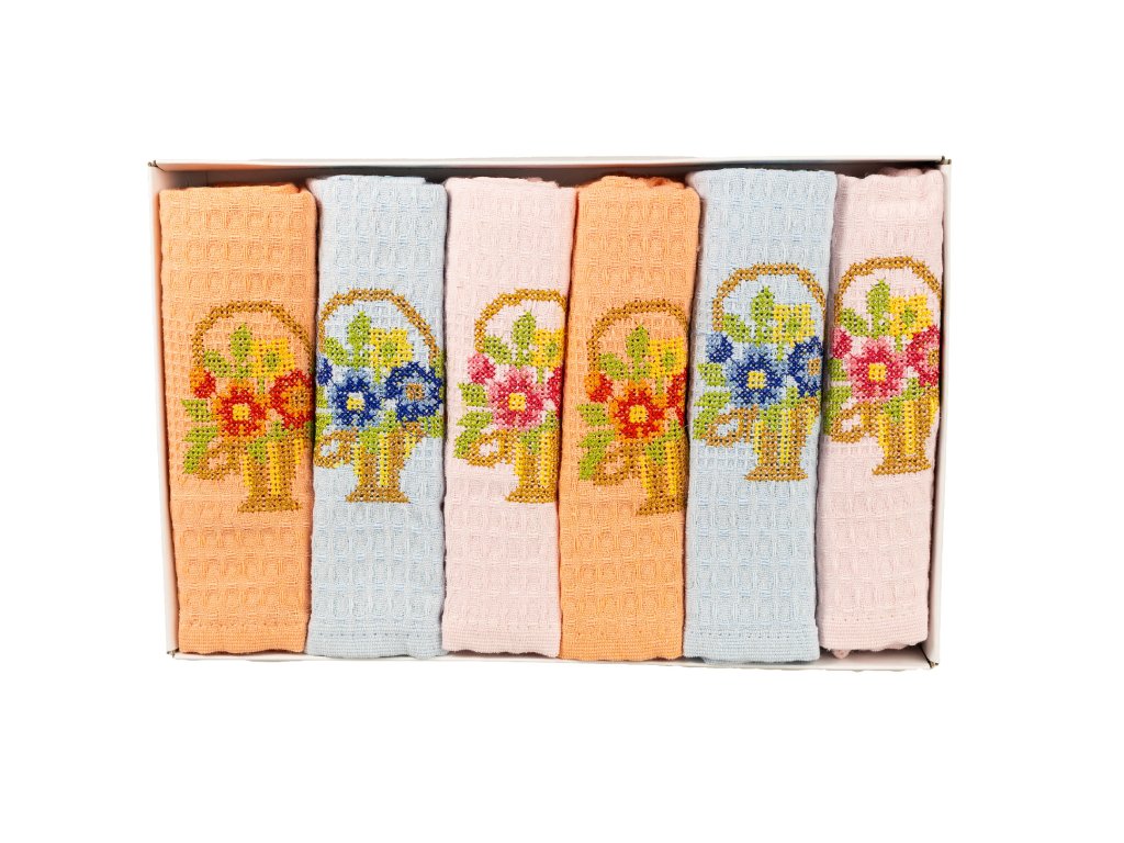 Dárková sada vaflových utěrek 6 ks Košík, je vyrobena ze 100% bavlny. Vaflový vzor je textilie s vazbou plastického povrchu a jeho charakteristickým jamkováním, kde hustě provázaná místa ve tkanině tvoří prohloubeniny. Utěrky z tohoto materiálu mají zvýšenou savost. Kuchyňské utěrky jsou v balení mix 6 barvách. Na každé z nich je vyšitý košík s květinami. Rozměry každé utěrky jsou 40 x 60 cm. Toto balení může být i krásným dárkem, který potěší ne jednu hospodyňku. V naší nabídce najdete kromě vaflových utěrek také malé ručníčky do kuchyně a koupelny s rozmanitými vzory, v pastelových a přírodních barvách. Utěrky perte vždy podle návodu, který je na obale a nepoužívejte prací prostředky s obsahem bělících a rozjasňujících substancí.